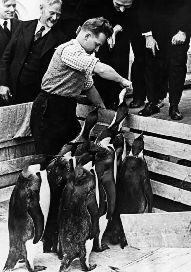 Антарктические трофеи «Швабенланда» – пингвины. Слева руководитель экспедиции Альфред Ритшер