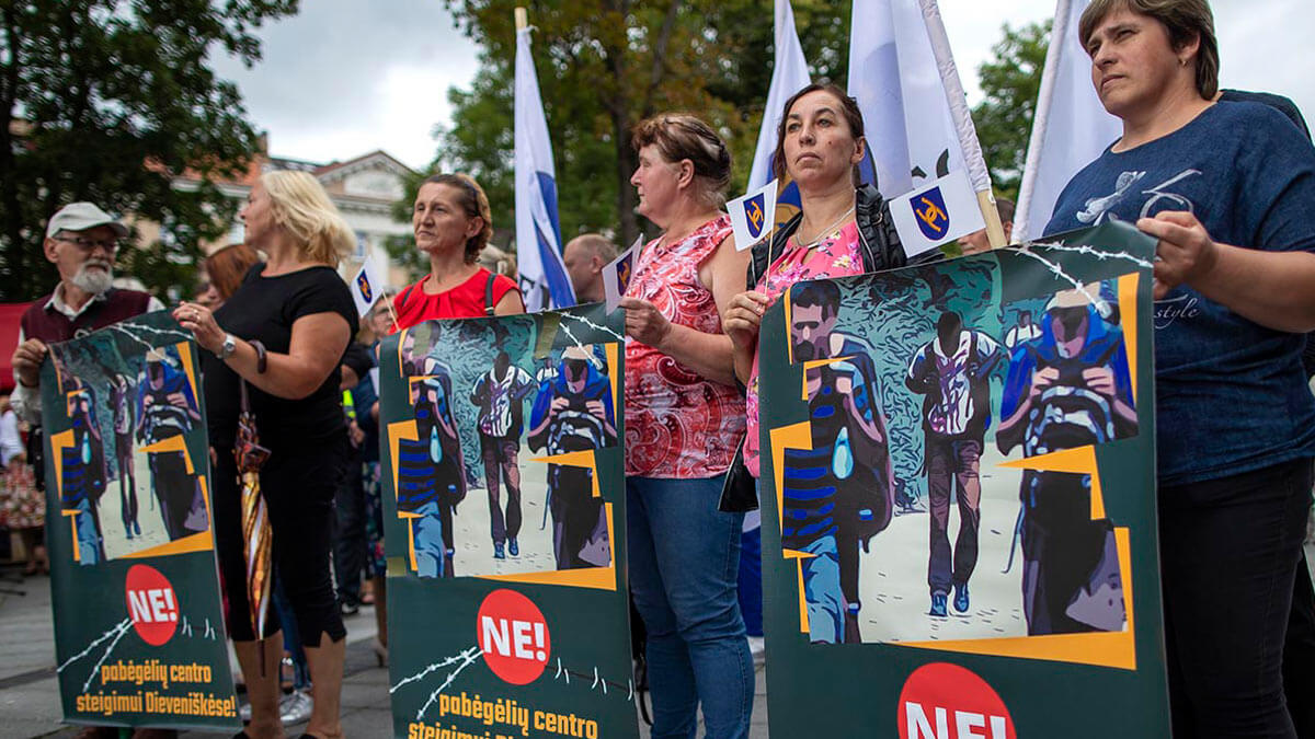 Протесты против лагеря беженцев в литовском городе Девенискес, 29 июля 2021 года