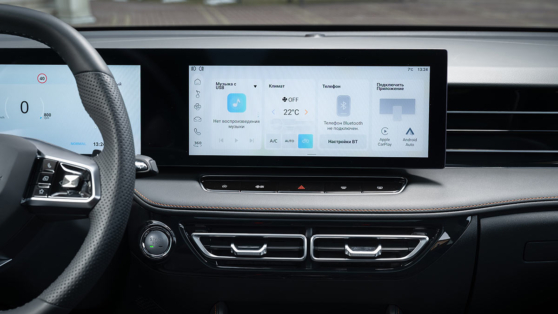 Перед водителем – два сдвоенных 12,3-дюймовых дисплея, причем очень неплохо русифицированных. Понятное дело, что управление большинством основных функций – с экрана центрального дисплея, но под ним – панель с крупными физическими кнопками, и это хорошо. Apple CarPlay и Android Auto есть, но воспользоваться можно лишь через кабель. Зеркала, к счастью, регулируются по старинке – с помощью физических кнопок на двери.