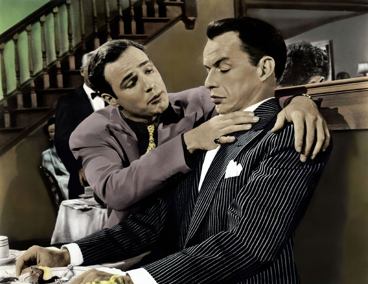 Неприязнь Синатры к Брандо обусловлена во многом тем, что у последнего была репутация бунтаря, анархиста и чуть ли не ниспровергателя основ. В 1953 году он сыграл вольного байкера в фильме «Дикарь». Синатра же всегда занимал агрессивно-консервативную позицию и никогда не жалел бранных слов для разного рода неформалов. Как назло, вскоре после триумфа «В порту» Синатра с Брандо попали в один фильм – мюзикл «Парни и куколки». Причем «неформалу» снова досталась именно та роль, на которую претендовал Фрэнк.