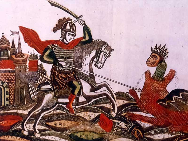 В граде Киеве о людях и «помину нет»: на сцене князь Владимир с двором, его богатыри, им противостоят иноземные цари и чудища, с которыми и расправляются богатыри. Наши сказания совершенно спокойно обходятся перечисленными персонажами. Кроме симметричных, условно формальных схем, какие-либо подробности мало интересуют былину.