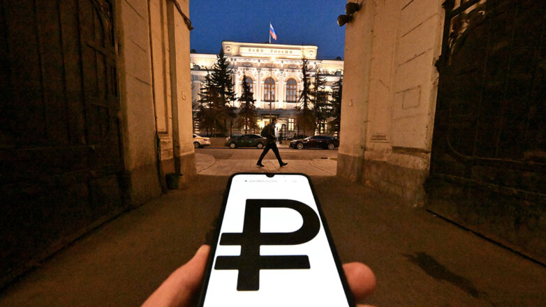 Знак рубля напротив здания Центрального банка РФ