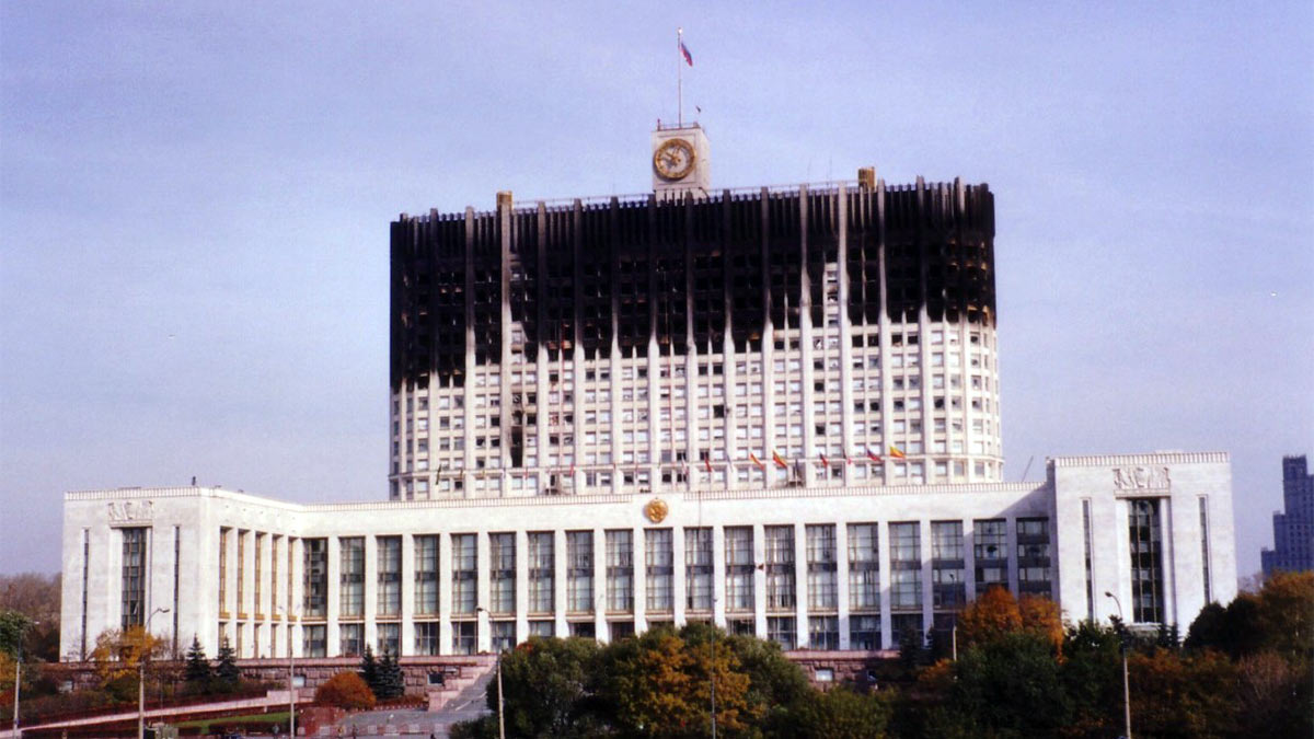 Фасад здания Верховного Совета после танкового обстрела, октябрь 1993 года.