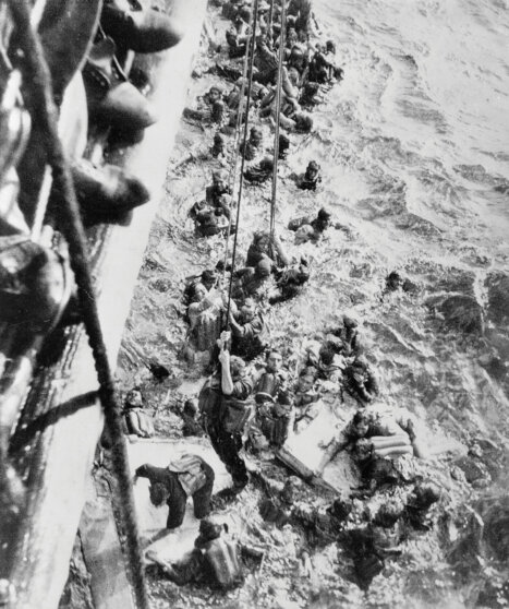 Английский крейсер "Дорсетшир" подбирает из воды моряков "Бисмарка", 27 мая 1941 года