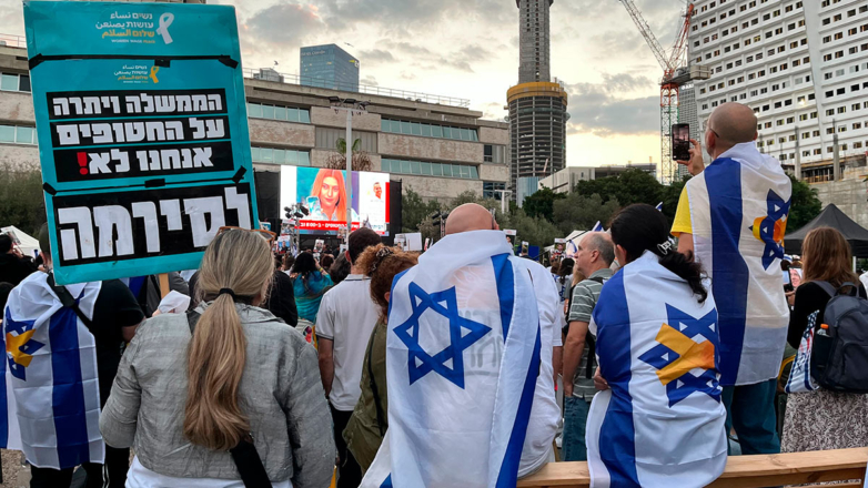 Люди собираются на площади Заложников перед освобождением израильских заложников