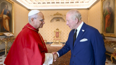 Карла III сопровождает королева Камилла. Королевская чета прибыла в Ватикан с государственным визитом, изначально запланированным на апрель и отложенным из‑за плохого самочувствия предыдущего понтифика Франциска (он умер 21 апреля).