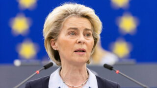 Фон дер Ляйен напомнила об антироссийских санкциях, введенных Евросоюзом. "Россия сползет в экономический, финансовый и технологический упадок, пока Украина марширует в сторону европейского будущего", – пообещала политик.