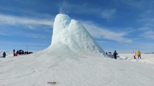 Такие ледяные вулканы появляются в холодное время года на месте подземного источника. Это происходит, когда артезианская вода бьет фонтаном и тут же замерзает под воздействием низких температур, превращаясь в ледяной столб.