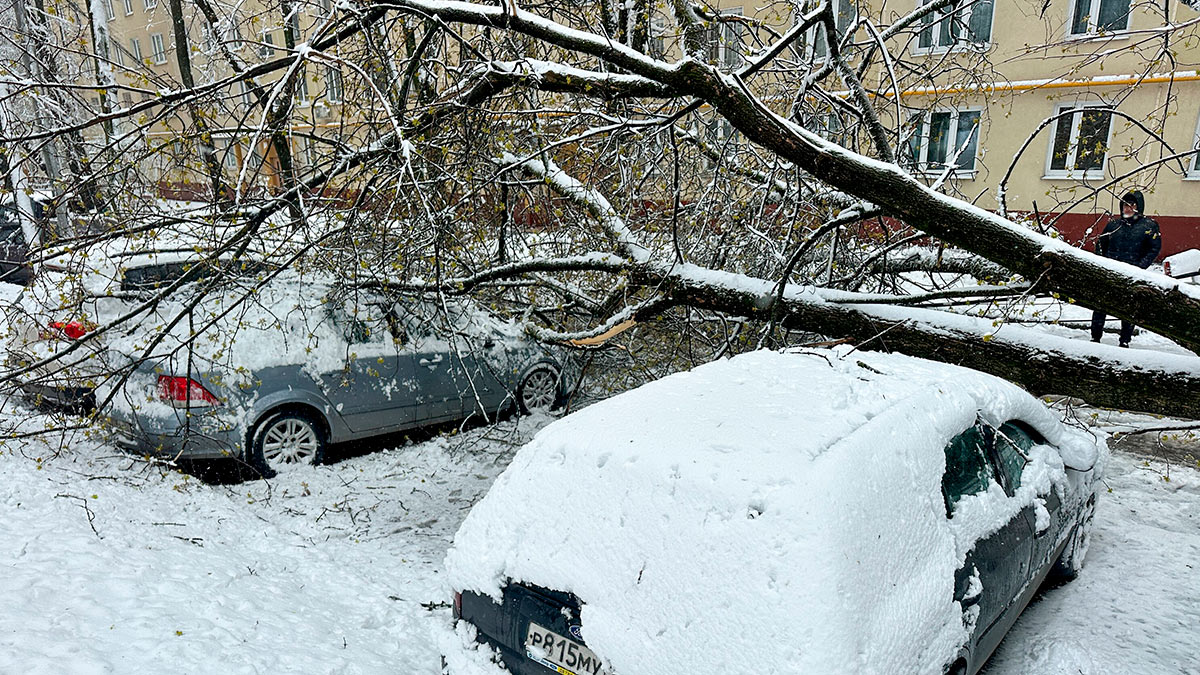Последствия падения деревьев на машины из-за снегопада и ветра