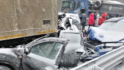 Ранее сообщалось, что число автомобилей, попавших в массовую аварию, увеличилось с 32 до 42. Возникшая из-за ДТП пробка составляет около 4 км. Среди пострадавших – 4 детей.