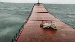 На ролике видно, как сухогруз раскачивается а волнах, после чего ломается в носовой части. Экипаж пытается связаться с диспетчером, но ответа не получает.