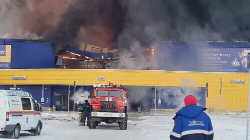 Также сообщается, что из-за пожара произошло частичное обрушение кровли на площади 3500 кв. м. Огонь охватил всю площадь здания.