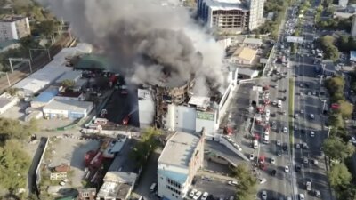 Судя по видео, снятому беспилотником, крыша торгового центра выгорела, а один из ее участков, вероятно, провалился. Точнее оценить масштаб разрушений видео не позволяет: на момент съемки здание торгового центра еще дымилось, в нем работали пожарные.