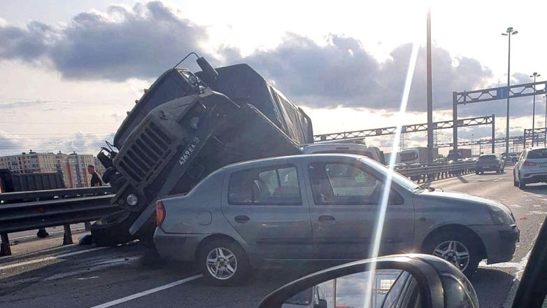 Крупная авария произошла на КАД вечером 22 августа. Два легковых автомобиля столкнулись с военным грузовиком.