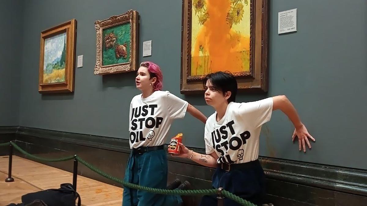 На них были футболки с надписью Just Stop Oil ("Просто покончите с нефтью"), пишет 14 октября Sky News. После того как активистки вылили на полотно банки томатного супа, они приклеили себя к стене возле картины. Отмечается, что сама картина находилась под защитным стеклом.