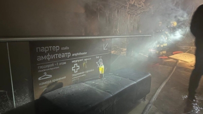 На кадрах видны металлические конструкции на месте стен зала, также можно разглядеть каркасы кресел. На них сверху упали осветительные леса и кровля. Сейчас спасатели пилят конструкции и занимаются разбором завалов.