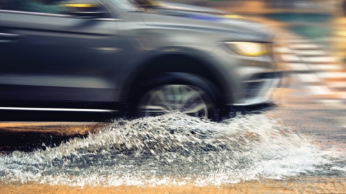 Автомобиль едет по лужам