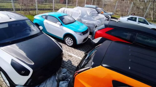 Еще пять автомобилей, стоящих на стоянке, это опытные "ё-кроссоверы" более позднего образца. На данный момент некоторые машины сохранили внешний лоск, а вот на укрытых чехлами автомобилях заметны повреждения.