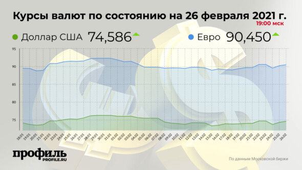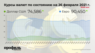 Так, по состоянию на 19:00 мск средневзвешенный курс американской валюты со сроком расчетов «завтра» повысился на 7256 пунктов (1 пункт соответствует 0,01 коп.) и составил 74,5866 руб. В то время как курс евро увеличился на 1808 пунктов до значения в 90,4503 руб.