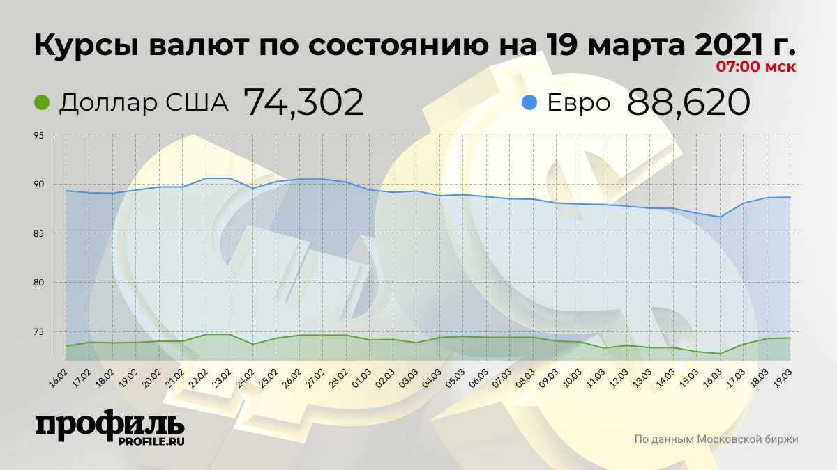 Напомним, что вечером в четверг, 18 марта, на закрытии торгов Мосбиржи средневзвешенный курс американской валюты со сроком расчетов "завтра" поднялся до 73,8489 рубля, а средневзвешенный курс евро повысился до 88,1692 рубля.
