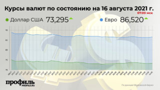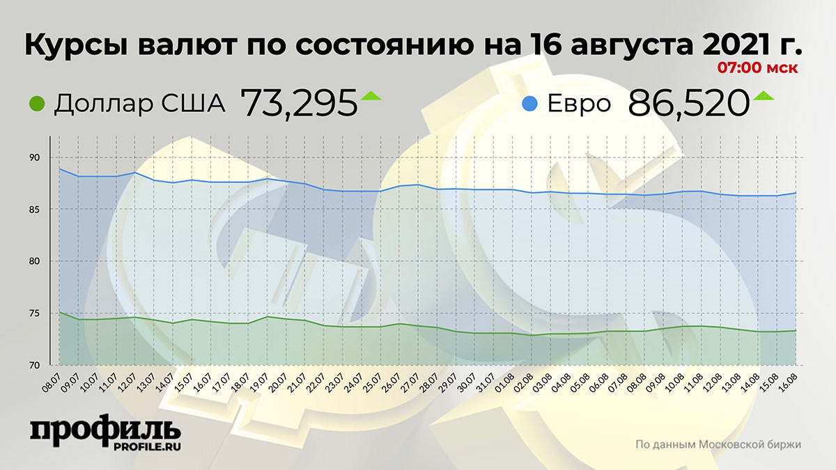 В пятницу, 13 августа, рубль укрепился к закрытию торгов. Средний курс доллара США по итогам торгов на Московской бирже со сроком расчетов "завтра" понизился на 1276 пунктов и составил 73,4 руб. Минимальный курс доллара составил 73,17 руб., максимальный – 73,64 руб. Средний курс евро понизился на 415 пунктов и составил 86,26 руб. Минимальный курс составил 86,13 руб., максимальный – 86,45 руб.