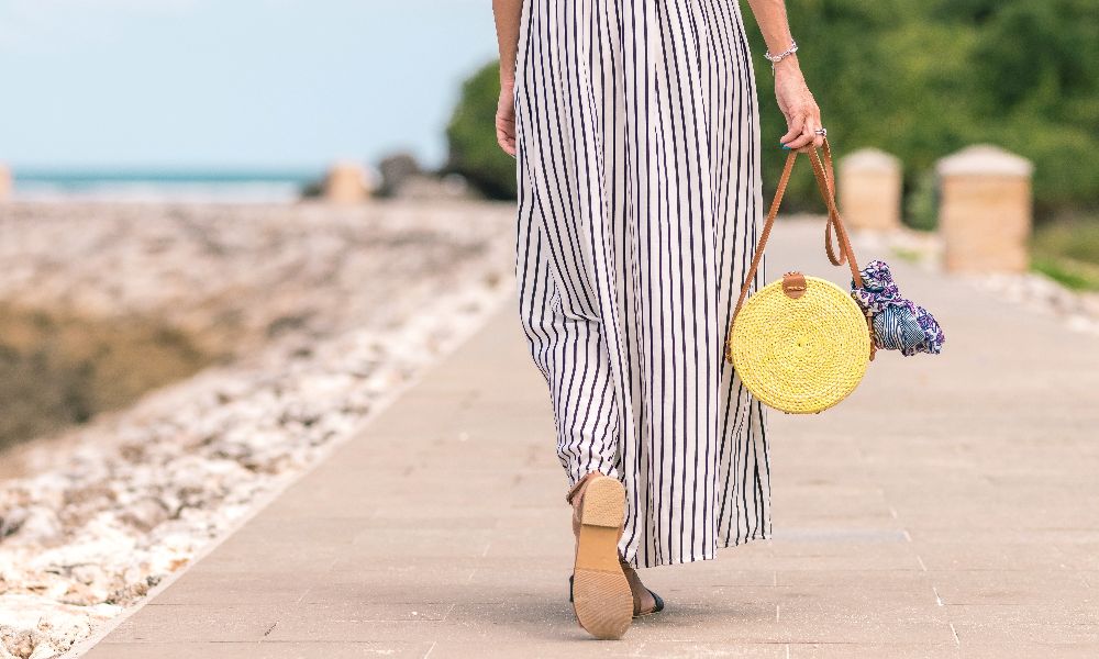 Вещи с изображением пальм и пляжей не под запретом даже в случае отпуска в городе. Брюки из тонкого льна с тропическими мотивами от Balmain будут отлично сочетаться с нейтральным верхом – например, хлопковым свитшотом Versace. Идеально завершат ансамбль греческие сандали бамбукового цвета Valentino и сумка-пазл с эффектом металлик Loewe.