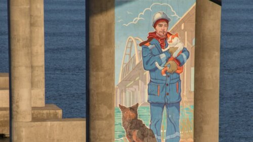 Уточняется, что 20-метровый рисунок нанесён на автодорожной опоре. Он будет виден пассажирам поездов, которые поедут по Крымскому мосту с 24 декабря. Граффити стало подарком художников к открытию железнодорожной части транспортного перехода через Керченский пролив.