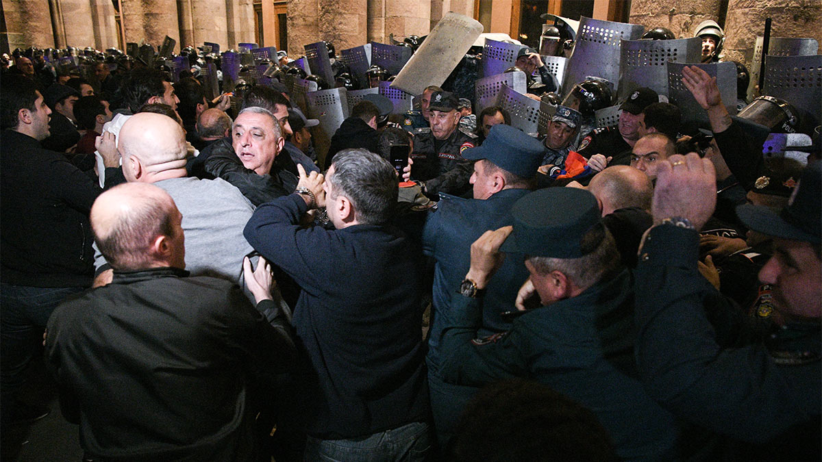 В среду после обнародования договоренностей между Баку и Степанакертом о прекращении огня жители Еревана стали собираться на площади Республики, где с утра уже дежурили силовики. Две ведущие к площади улицы были перекрыты манифестантами.