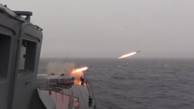 На снятых кадрах виден запуск зенитных ракет и работа корабельной артиллерии.