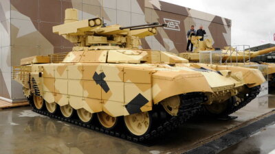 Разработка БМПТ началась в 1990-х годах с учетом опыта боевых действий в Афганистане и Чечне. Машина способна поражать живую силу, легкобронированные боевые машины, танки и БМП, а так же совместно с войсковой ПВО вести борьбу с вертолетами и беспилотниками. Вес машины составляет около 50 тонн, экипаж – 5 человек. Ее боевой модуль включает две 30-мм автоматические пушки, 7,62-мм пулемет, управляемые ракеты "Атака" и автоматические гранатометы АГ-17Д. Машина может строиться на шасси танков Т-72 и Т-90. Летом 2017 года "Терминаторы" впервые прошли испытания в Сирии. Кроме российских вооруженных сил, БМПТ также закупила армия Казахстана. Первая публичная презентация БМПТ состоялась в 2013 году на выставке Russian Arms Expo (RAE)-2013 в Нижнем Тагиле.