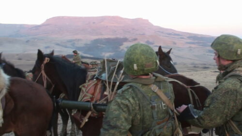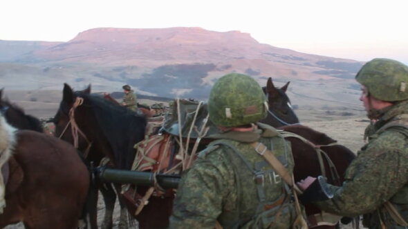 Учения проходили на местности со сложным рельефом, и поднять тяжелое вооружение и боеприпасы на высоту 1500 метров «на руках» было практически нереально. Тогда стрелки погрузили боевое снаряжение на лошадей местной карачаевской породы, прикрепив груз к так называемым «волчьим шкурам», то есть к тамошним вьючным седлам.