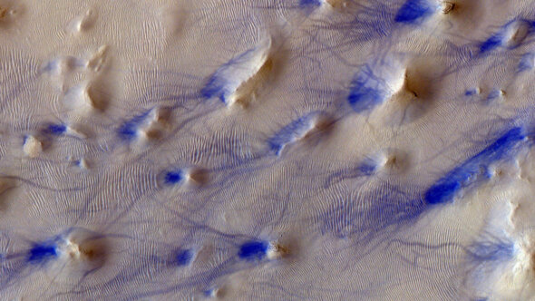 Ученые пока еще точно не знают, как именно образуется хаотический рельеф. Новое фото поверхности Марса показывает, что в этом районе четвертой планеты могут господствовать дующие в направлении от полюса к полюсу ветра. Синий цвет на фотографии, объясняют астрономы, получился в результате использования светофильтров. Человеческий глаз увидел бы этот участок поверхности Марса в других цветах.