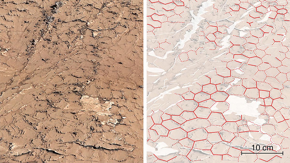Минеральный состав слоев отражает разные эпохи в истории кратера Гейла на Марсе. Таким образом, по мере того как грязь засыхает, она сжимается, создавая T-образные трещины. Повторяющиеся циклы размягчают их, превращая их в Y-образные. Тем самым создается шестиугольный узор. Ученые подчеркивают, что засушливые и влажные периоды проходили на планете в течение длительного времени. По краям возникавших в породе трещин образовывалась сульфатная корка, которая закаменела и сохранила форму на миллиарды лет.