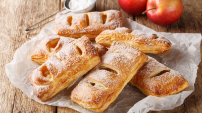 Тесто слегка раскатываю на подпыленной мукой поверхности и нарезаю на квадраты. В центр каждого выкладываю яблочную начинку, сверху кладу маленький кусочек сливочного масла – он делает вкус более мягким и насыщенным. Формирую слойки конвертами или треугольниками и хорошо защипываю края.
