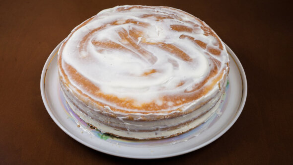 - Промажьте коржи кремом и выложите в виде торта. Обмажьте кремом и боковые части торта.