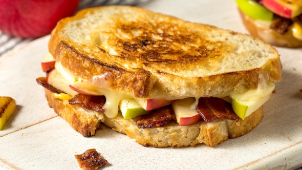 - Смажьте кусочек хлеба столовой ложкой горчицы. Сверху слоями выложите три ломтика сыра, порцию бекона и часть яблок. Накройте вторым кусочком хлеба.