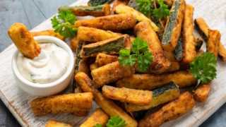 - Налейте в сотейник растительное масло, разогрейте его на сильном огне. Опускайте кабачки в горячее масло небольшими порциями. Каждую порцию кабачков жарьте по 35–40 секунд.
