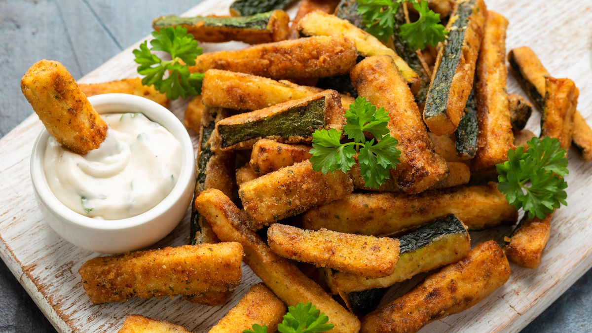 - Помойте и вытрите кабачок, очистите от кожуры. Подготовьте дуршлаг, большую миску с крышкой, фритюрницу или сотейник (сковороду с высокими бортиками).