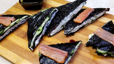 - Когда рис остынет, выложить на доску квадратный лист нори. В первом углу листа выложить немного риса, справа от него – слайсы красной слабосоленой рыбы, а снизу от нее – нарезанные тонкими кружочками огурцы. Последний угол смазать сливочным сыром.