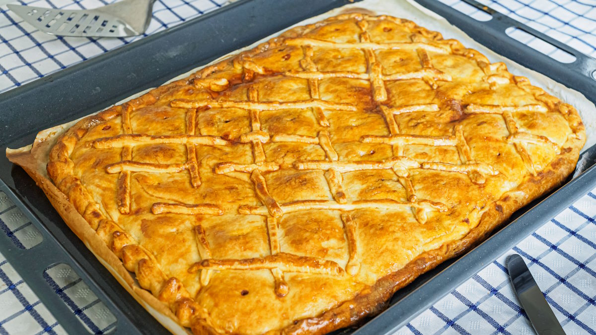 - Заранее размороженное слоеное тесто раскатайте в два равных по размеру тонких прямоугольника. Противень или неглубокую форму смажьте растительным маслом, сверху выложите один пласт теста и сформируйте бортики.