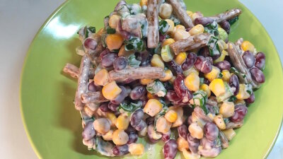 - Петрушку и укроп вымойте и мелко нарежьте. В салатнике соедините консервированную фасоль и кукурузу, сухарики, измельченную зелень. Салат заправьте майонезом, перемешайте. Подавайте его сразу же, пока сухарики не размокли. Приятного аппетита!
