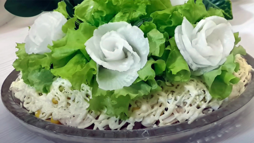 - Далее останется выложить сделанные таким образом несколько "роз" на салат – и можно подавать блюдо на стол.