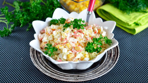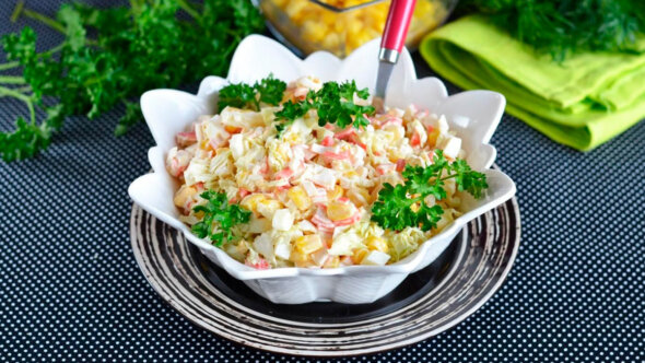 Как приготовить салат без риса с крабовыми палочками и кукурузой
