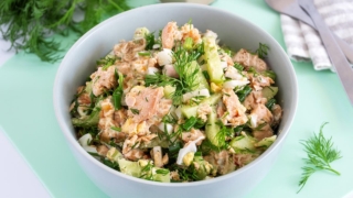 - Смешайте все ингредиенты с рыбой в салатнике. Посолите по вкусу. Заправьте полученную смесь майонезом и тщательно перемешайте. Готовый салат можно подать к столу сразу или поставить в холодильник. Приятного аппетита!