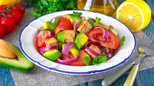 - Возьмите большую миску для салата: смешайте в ней помидоры, авокадо, лук, тофу. Полейте сверху заправкой.