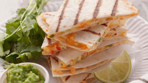 - Тортилью нужно аккуратно разрезать и выложить туда готовое яйцо. Затем туда выкладываются ломтики сыра и колбаса. Последними в бутерброды кладут кусочки плавленого сыра, кружочки помидоров. Сверху выкладывается еще один слой сыра.