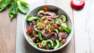 - Выложите овощной микс на блюдо, сверху разложите ломтики говядины, посыпьте рубленым арахисом и полейте приготовленной заправкой. Салат рекомендуется подавать, пока мясо еще теплое.