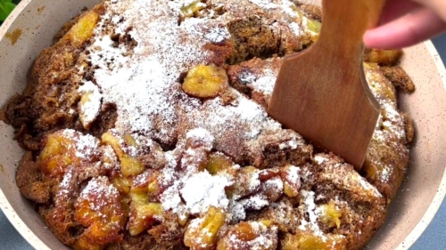 - Распределите бананы на сковороде, сверху влейте тесто и равномерно распределите его. Накройте крышкой и готовьте около 10-15 минут на среднем огне.