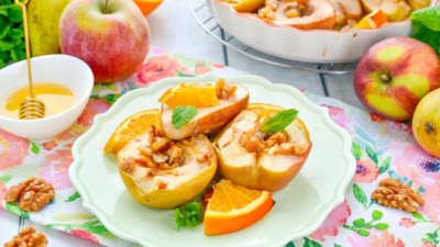 - В центр каждого фрукта кладутся маленькие кусочки сливочного масла. Затем они посыпаются рублеными орехами и поливаются медом. На этом этапе можно добавить корицу.