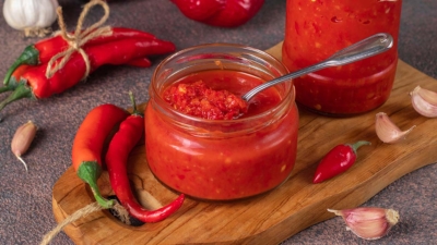 Аджика готова! - Простерилизованные и охлажденные стеклянные банки наполните аджикой, закройте металлическими закручивающимися или капроновыми крышками и поставьте в холодильник.
